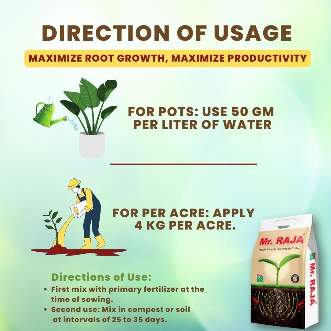 - 🌸 For pots, use 50 gm per litre of water. For per acre, apply 4 kg per acre. First use: Mix with primary fertilizer at the time of sowing. Second use: Mix in compost or soil at intervals of 25 to 35 days.