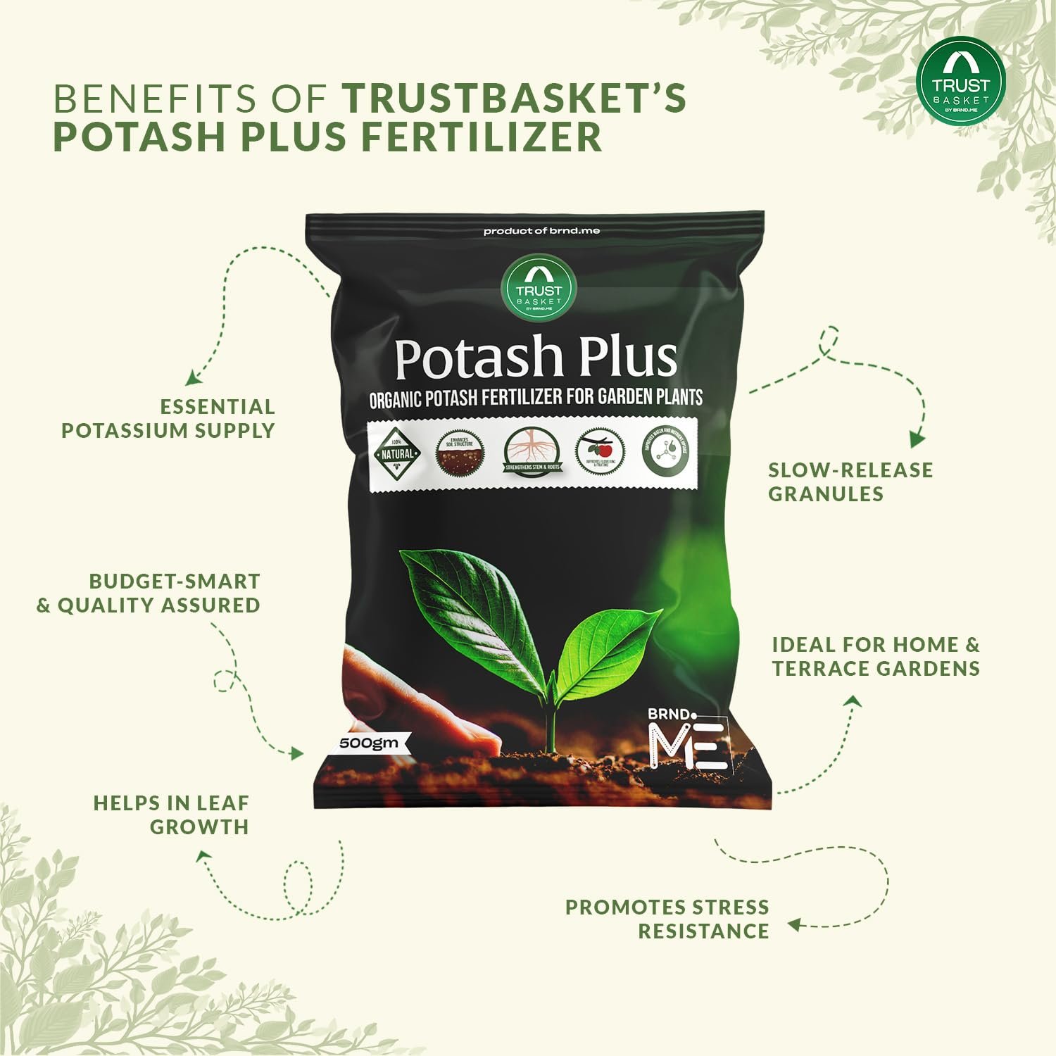 - Organic & Safe Bio Potash Formula for Home Gardens – TrustBasket Potash Plus is a gentle yet effective potash, potassium for plants, and potash for plants choice for eco-friendly gardening. As a high-quality potassium fertilizer for plants, it replaces harsh chemical potash fertilizer with a natural alternative. Ideal for those who prefer organic potash, bio potash, or bio potash fertilizers for plants, it supports long-term soil health. The product is odor-free, safe for indoor/outdoor use, and suitable for food crops.